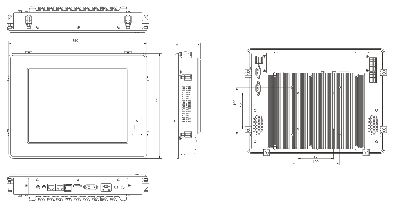5*RS-232, 1*RS422/485,2个DB9接口RS-232 3个三线RS-232, 2*USB2.0,2*USB3.0, 1*14BIT GPIO端口, 1*LINE OUT 1*MIC, 2*Wifi天线接口, 1*按钮开关, 1*VGA 最大分辨率支持2048x1536 1*HDMI 最大分辨率支持3200*2000@60HZ |