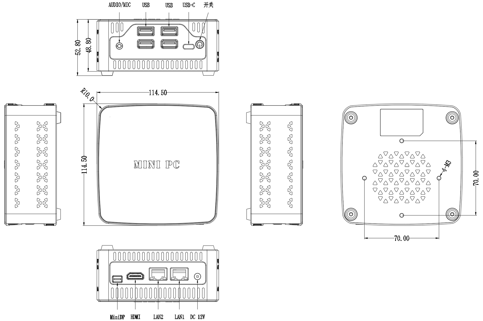 机器尺寸114.5x114.5x52.8mm,天地盒包装尺寸181*153*112mm;外箱尺寸:485*380*260mm